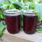 When the beets are cooked, rinse them once with cold water – wear gloves! – the skins slide right off, who knew? – then dice them into whatever uniform shape you wish and drop into the sterilized jars. Fill the jars with the hot brine, leaving only about 1/4 inch – the beets need to be covered – and put the lids on. With this recipe, the jars don’t need to be processed, but they should sit for a couple of days until the lids ‘pop’ and you know you have a solid seal. Mom also recommended that I not eat any for at least a week, in order to allow proper ‘pickling’.