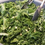 Heat up the olive oil in a large skillet and add the garlic, stirring it around quickly so that it doesn’t burn. Add in all of the kale and use tongs to toss it gently and move it around. Sprinkle on some salt and pepper and continue to cook it for a couple of minutes until it just starts to wilt. Remove the kale to a plate and serve it up – enjoy!