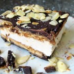 Remove the pans from the oven and sprinkle on an even layer of chocolate chips. Allow the pans to sit for about 5 minutes so the chocolate can soften, and then use another spatula to carefully and evenly spread out the chocolate, like icing – a nice thin layer will work out better for you in the end, so don’t go crazy with the chocolate chips! While the chocolate is still warm, sprinkle on the toasted almonds and then finish both pans with a fine dusting of sea salt. Transfer the pans to the freezer for about an hour.