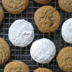 Use a tablespoon sized cookie scoop to scoop the batter out into tidy balls and shape them in your hands to get them nice and round. Place them on the prepared cookie sheets about 2 inches apart – they will flatten, but they won’t spread too much. For myself and my cookie scoop sized balls, I baked them at 325 for 13 minutes and got 25 perfect cookies out of this recipe, you want them to bake until they are lightly browned. Allow the cookies to cool on the pan and then roll them in icing sugar completely before serving (or freezing).