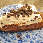 Just before serving (or right before your guests arrive), beat the remaining 1 and a 1/2 cups of cream and 1 teaspoon of vanilla on medium-high until stiff. Run a knife around the edges of your spring-form to loosen the pie and remove the side of the pan (you can also attempt to loosen the bottom of the spring-form to remove, I chose not to risk it). Set the pie on a large serving platter, mound the whipped cream over the mousse and cover with chocolate shavings. Put it back in the fridge if you need to, but it should slice quite easily (running your knife under hot water helps) – and of course, everyone will love it!