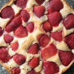 Scrape the batter into your prepared pan and tightly arrange the halved berries, cut side down, so that the top of the cake is covered – aim for a single layer, you may need to overlap a few. Use the remaining 2 tablespoons of sugar to sprinkle evenly over all of the strawberries. Bake the cake for 10 minutes, then reduce the heat to 325 and bake for about another hour. You can try and check the middle with a toothpick, but I found it easiest to lightly check the batter that was poking between the berries, just by touch – my total baking time was 70 minutes. Allow the cake to cool on a rack and then serve it up with whipped cream – enjoy!