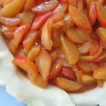 Once the juices are reduced and your first sheet of pastry is lining the pie plate, toss the plums with the brown sugar, cornstarch, salt and cardamom and then scrape this whole fruit mix into your prepared crust. Drizzle the reduced juices evenly over the plums, and then cover with the second sheet of pastry, dampen, trim and flute the edges and cut a couple of air vents into the top. Brush the crust with beaten egg, and then carefully sprinkle with the sugar. Your pie will be full – I would recommend baking it on a baking sheet covered with parchment.