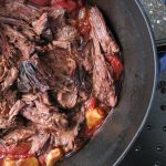 Preheat the oven to 300 and lay the onion slices on the bottom of your braising pot. Place the beef on top of the onions – it can be a tight fit, the roast will shrink quite a bit – and season it generously with salt and freshly ground pepper, then pour in the tomatoes and scatter the garlic around it. Braise in the center of the oven, covered, for 3 to 4 hours until the meat is very tender – I ended up leaving mine for close to 5 hours and it was still beautiful.