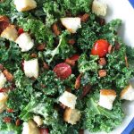 Add the kale and tomatoes to a large salad bowl, drizzle on about half the dressing to start…add more as needed after tossing, finish with the croutons and extra Parmesan (and bacon) – enjoy!