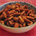 Brock and I found this online years ago to be used as a salad garnish – preferably in a lettuce, pear and gorgonzola salad. But the pecans are so tasty that they also make a great appetizer that no one can leave alone.