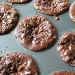 Add in the eggs one at a time, whisking well after each addition, then add in the flour and beat by hand for about a minute. Stir in the walnuts and then spoon the batter evenly between the prepared cups, the batter will be very thick. These cupcakes don’t really rise, but I would recommend you fill each cup about 2/3’s to the top, then they will all be full to brim after the chocolate goes in. Press some chocolate into the center of each cup to create the ‘chocolate center’ (I was quite liberal with the chocolate, but the original recipe says ‘a few chips’), then add a titch of water to any empty muffin cups, and bake for 15 to 20 minutes until the edges are set, but the middles are soft. It is very difficult to tell when these are cooked – I left mine for a full 20 minutes.