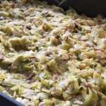 Jamie Oliver is the king of comfort food ‘pies’. I’ve tried a couple of his recipes but when I saw this on the Food Network in his Christmas Special, I knew I’d be making this for everyone on New Year’s Eve (the recipe below, doubled, and in my roasting pan). The time eaters here are the leeks, which can be washed and chopped ahead and refrigerated still wet, and the turkey or chicken, which needs to be cooked. If that’s done, this is actually quite quick, and as New Year’s proved, excellent for company. I looked the recipe up on the internet, and basically just added more bacon. Soooo good!!