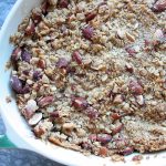 For the topping, combine the flour, sugars, salt, oatmeal and butter in the bowl of your electric mixer and mix on low for a minute or 2 until the mix is in large crumbles. Stir in the nuts, if using, and then sprinkle all of the topping evenly over the fruit. Place the casserole on a parchment lined baking sheet and bake for 50 minutes to an hour until the topping is a golden brown and the fruit is bubbling throughout. We enjoyed ours warm with vanilla ice cream.