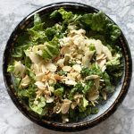 When you’re ready to serve the salad, add the bok choy, scallions, as well as the noodle and almond mix and give it a toss, then shake the dressing again and drizzle it all on. Give the salad another toss to combine and serve.