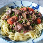 When you’re about 20 minutes away from dinner (timed with your noodles or mashed potatoes), heat the stew up to just barely simmering, add in the cream, parsley, tarragon and frozen peas and allow it to simmer gently until all is heated through. Serve it up over your chosen sauce-soaking-up goodness and call it a very good day.