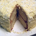 Place one cake on a flat serving plate and spread with frosting and then place the second layer on top. Frost the top and sides – the only trick to this is to be patient and do it slowly – and then to decorate it, sprinkle the top with the coconut and gently press some coconut into the sides as well.
