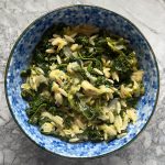 1, 300 g package of frozen, chopped spinach – thawed and squeezed of water OR any combo of fresh greens, I’ve used kale, Brussels sprouts, fresh spinach