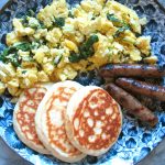 Thanks to Ms. Bennett, the girls’ rock star Foods teacher at school! You can see the photo…this is the fancy version because it was a weekend (spinach and cheese on the eggs, barbecue started for the sausage), but this is the amount of food the girls eat for a regular breakfast – with SIX pancakes instead of just 3. I know, they’re growing…but it’s still shocking to me sometimes. I’m grateful for no-brainer recipes that the girls can also make themselves – tasty also from the freezer (heated in the toaster), and super easy to whip up – enjoy!