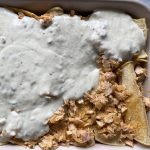 I’ve taken the time to individually heat, and therefore soften the corn tortillas in a dry pan, or in a lightly oiled pan – I’ve also tried covering them with a clean damp cloth and microwaving them for several seconds. After the effort, most cracked by the time I had all 12 filled and at the end of the day, you’re hiding everything with white sauce! We still prefer the rolls (instead of lasagna noodle style), because it’s easier to dish up portions and quite simply, enchiladas are rolls, not lasagna layers.