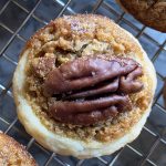 When you’re ready to get baking, preheat the oven to 350, take the shells out of the freezer, sprinkle the finely chopped pecans evenly at the bottom of the 24 tarts and start the filling.