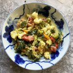 4 to 5 c. assorted vegetables – you can roast or steam them first, or make sure they’re all cut to an even size so that they cook evenly in the coconut milk – we love broccoli, cauliflower and peppers, but asparagus, carrots, mushrooms and potatoes would also be very tasty