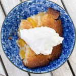 When the butter is melted/browned a bit, carefully take the hot dish out of the oven and pour all of the batter over the melted butter. DO NOT MIX. Scatter the fruit over the top with a heavier focus on the middle of the pan instead of the edges and then bake for 30 to 45 minutes (longer if you’ve doubled the recipe) until the whole thing is a rich golden brown.