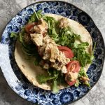 Once all of your ingredients are ready, build your plate! Our favorite line-up so far is fresh pita, smear of tzatziki, arugula, (a lot of) chicken, tomatoes, olives and more tzatziki on top. This is a very easy meal to dish up way more than you can manage to eat – you’ve been warned!