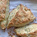 Preheat the oven to 425 and line a baking sheet with parchment. In a large bowl, whisk together the 6 dry ingredients, then add in the cubed cold butter and use a pastry cutter to work it in until the pieces are pea-sized and all is well combined. Add in the chopped scallions (or green onions) and toss well to coat.