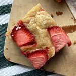 Fold in the chocolate and/or nut chunks and then lightly and evenly press the batter into your prepared pan. Arrange the strawberries as you wish across the top and give each a light press so that they stay put. Bake for 25 to 30 minutes until the edges are browned and the center is set. Allow the bars to cool completely in the pan on a rack before using the parchment to remove to a cutting board and slicing. Enjoy!