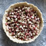 Evenly arrange the rhubarb in the prepped pie shell. In a medium bowl, whisk together the egg, sugar, sour cream and flour and then scrape and pour this mix over the rhubarb. Use a small utensil to wiggle the rhubarb a bit so that the filling is evenly dispersed through the fruit.