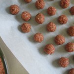 Combine everything in a large bowl, working with your hands at the end to make sure all is well- mixed. The key to these is to make them small – roll them into balls about the size of about 1 teaspoon.