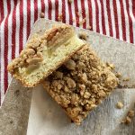 Assemble the cake! Scrape the batter evenly across the bottom of your prepared pan and smooth out the top. Use your hands (easiest) to overlap the apple slices evenly across the top and then scrape and pour any juices that accumulated evenly over all. Break up the crumbs if needed and generously and thickly layer on the crumb mix and give it a gentle pat so that it’s as even as possible.