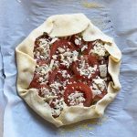 If you’re using a large baking sheet, both tarts should fit, so lay out the pastry circles on the corn meal sprinkled parchment and don’t worry about overlap at the moment, you’ll be folding up the edges.
