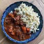 Braise/bake for about 2 and a half hours, stirring every 30 to 45 minutes or so until the beef is fork tender. Serve on egg noodles that have been tossed with sour cream and parsley – this makes a big batch but the leftovers are also amazing!