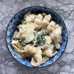 When the pasta is cooked, zest in the lemon and squeeze in the lemon juice and give it a quick stir, then pour in the cream, allow it to heat through and then work in the spinach and parsley – this may take a few minutes – leave the heat on low.