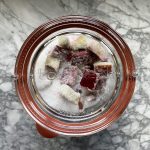 Fill your jar(s) with the rhubarb, add in all of the sugar and give it a good shake. I filled my 1 L jar with the rhubarb and sugar and then removed a third to my half litre jar after it had macerated overnight so that all of the vodka would fit.