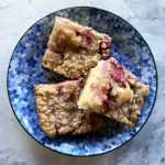Evenly dollop the batter over the bottom of your prepared pan and use an offset spatula to spread it out into an even, thin layer. Scrape the rhubarb mix evenly overall, aiming to have the rhubarb pieces in a single layer. Stir together the crumble mix, adding the melted butter last, and then scatter as evenly as possible over the rhubarb.