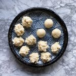 Weigh out the dough to achieve 24 even perfect cookies (for myself and this batch it was 30 grams/cookie), roll the portions into balls and then refrigerate for about a half hour.