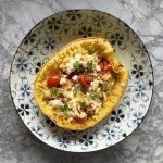 Preheat the oven to 400 and set the halved squash on a parchment or foil lined baking sheet. The order that works for me is to; rub or spray each liberally with olive oil, rub on some minced garlic and sprinkle lightly with salt and freshly ground pepper (and red pepper flakes, if using). Place the feta block in the center of each, fill with tomatoes and sprinkle on some onion (if using). Bake for 30 minutes to an hour and 15 minutes or so – this is dependent on both squash size and how long you microwaved each prior to cutting in half – you want the squash very fork tender.