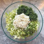 Thinly slice all of the clean, dry romaine into a large salad bowl and add the remaining green onion, dill and feta – this is a perfect way to transport the salad to someone’s house.