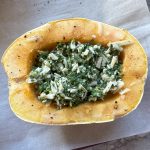As the squash are (pre) roasting, mix the cream, spinach, sage, thyme, fontina and gouda in a large bowl and season to taste with salt, pepper and red pepper flakes. When the squash has finished it’s initial roast, sprinkle half of the provolone evenly across the bottom of the 4 halves, and then divide evenly and spread the cheesy spinach goodness into each. Cover the filled squash with foil and bake for 30 minutes.