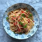 Bring 3 to 4 cups of water to a boil and in a large pot or skillet, place the spaghetti (break it in halve if you need to make it fit), tomatoes, lemon zest, olive oil and salt. Carefully add the boiling water to the pan (this is also a good place to throw in any extra tomato sauce etc. that you have on hand), cover your pan and bring everything to a boil. Reduce the heat and simmer for 6 to 10 minutes until your pasta is barely al dente, use tongs to move everything around so that the spaghetti doesn’t clump and then add in the greens that you’re using and continue to simmer until the liquid has reduced to a point to make you happy. Taste for seasonings, dish up into large bowl and garnish generously!