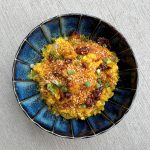 Remove the foil, fluff the rice with a fork and sprinkle the whole casserole with all 3 toppings – or – leave the toppings available for everyone to individually garnish as they please.