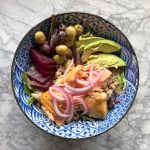We made dinner ‘bowls’ with this salmon delicious-ness – warm farro, mixed spring greens, pickled red onions, pickled beets, olives, Gingery Lemon Tahini Sauce, and avocado – really wonderful combination!