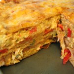 This is adapted from Whitewater Cooks at Home by Shelley Adams and it was very tasty – and very filling. The recipe says that you can ‘build’ the pie the day before you cook it and even though it’s looks a bit daunting, it’s actually quite straight forward if you’re organized. I made this during the week so I used cut up roast chicken that I had in the freezer and I had the onions and peppers already chopped. I also think that substituting vegetables for the chicken (or simply adding more of either) would work just fine, and more ‘heat’ could easily be added as well.