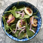 This is a regular is a lot of households and is another goodie from the Best of Bridge. I’m just listing the dressing here, but we usually have it with some green or red onion, (quick pickled red onion works brilliantly here!), 2 or 3 boiled eggs chopped up, some sliced mushrooms (lightly sautéed in butter), crispy bacon, and of course, lots of spinach.