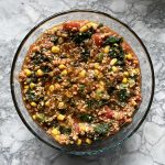 Add the drained pasta, the spinach (or kale), mix well, then stir in the mozzarella (save some for the topping if you’d like). Divide into the greased casseroles that you’re using and sprinkle with the Parmesan ( I don’t sprinkle on the Parmesan if it’s going in the freezer). Bake at 350 for about half an hour until it’s bubbling. If you freeze it, thaw completely, add about 1 cup or almost 1 can of V-8 juice or tomato juice (for a 2.5 litre casserole), sprinkle with Parmesan and again, cook until bubbling – it may take longer than a half hour.