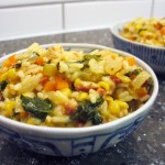 When the rice is about halfway cooked, maybe 10 minutes in, add the corn and bacon and continue with the addition of the broth. I find that risotto usually takes about 20 minutes and that I usually use about 7 cups of broth, I also find that you shouldn’t ever need to add salt because of the broth and the cheese.