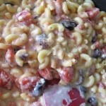 8 oz. brown rice macaroni (I weighed it but it’s a good 2 cups) – OR – try a 454 g box of Barilla macaroni and make a bit more of the sauce (I did still 1 can of tomatoes, but 3 c. milk, 1 1/2 c. feta, more olives and garlic)