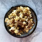 Spread the nuts onto a greased cookie sheet or a cookie sheet covered with parchment – and I spray the parchment, spread the coated popcorn over the nuts, and bake at 250 for about 30 minutes, stirring carefully at 10 minute intervals. The nuts will be well mixed in with the popcorn by the time it’s all finished baking. I’ve also laid everything out on the parchment and then drizzled on the sauce…do as you wish, it will all work out. Cool, eat and enjoy – it won’t last long.