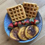 For both waffles and pancakes, cook them as you normally would and keep them warm in a 200 oven until all have been cooked. We actually let the batter sit for about an hour while we took the girls to soccer and the pancakes were just as good before, as they were after the practice.