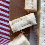 Bake for about 50 minutes or until it’s just golden. Allow the shortbread to rest in the pan for about 10 minutes, then grab hold of the parchment overhang, and being very slow and careful so as to not crack it, lift the whole thing out onto a cutting board and cut it into finger-sized pieces.