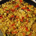 Meanwhile, in a separate skillet, heat up a bit of olive oil and saute the onion for a good 10 minutes until it starts to caramelize, then add in the eggplant and continue to cook and stir until the eggplant looks as done as you’d like it (for me, it was about another 10 minutes). Next add in the red pepper and saute until all of the vegetables are nicely mixed – feel free to add salt and pepper but the broth should be adding a lot of extra flavor to the couscous.