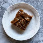 Beat together the butter and brown sugar, then add the egg, mix well and then add in the lemon juice and mix well. Add the flour and mix carefully until it’s all worked in – the dough may be crumbly, but will likely be more like thick cookie dough – and then press it into your prepared pan and prick it all over with a fork. Bake for 15 minutes, remove it from the oven and spread the pecan halves evenly over the whole base.